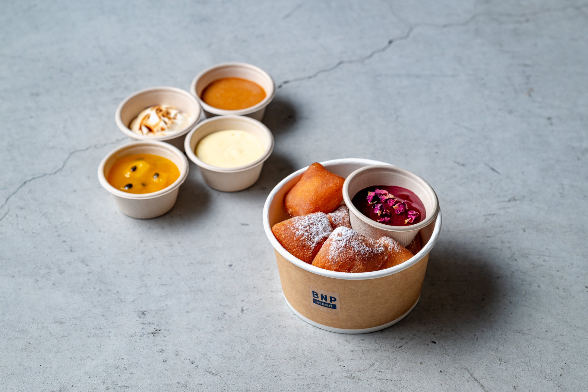 当店の名物ベニエを映画を見ながらでも食べやすくアレンジしました。上映予定の映画をイメージした毎週変更予定のディップソースとご一緒にお試しください。