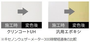 近年、生産施設ではブランドイメージ向上のため、設備面や建築的な美しさに工夫を施し“魅せる工場”として施設をそのシンボルとする事例が増えています。“魅せる工場”では、床材にも白を基調とした明るい色や、各企業のコーポレートカラーが採用される傾向があります。しかし、一般的に使用されているエポキシ樹脂系塗り床材や硬質ウレタン樹脂系塗り床材は耐久性や耐衝撃性にはすぐれているものの、太陽光が差し込む窓際や蛍光灯から発する紫外線で変色しやすいという問題を抱えており、紫外線対策は必要不可欠でした。