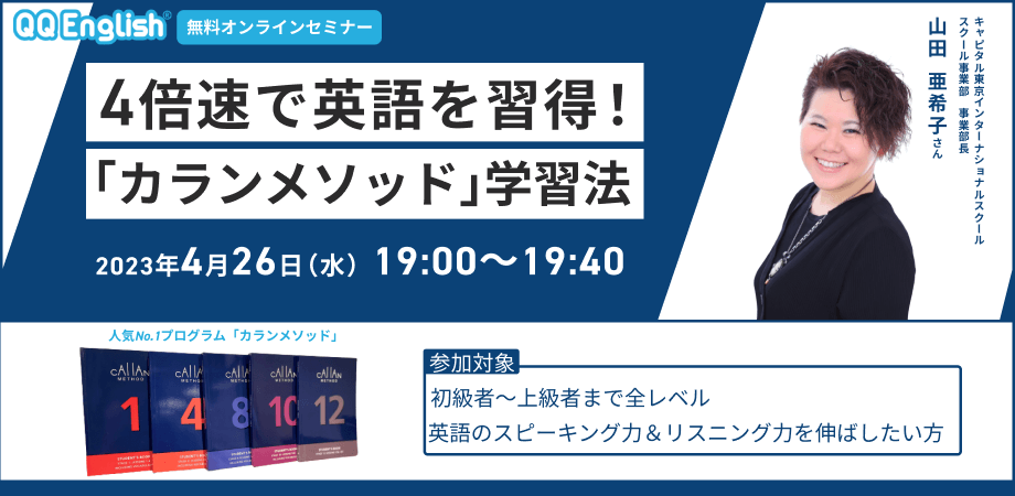 2023年4月26日(水)に開催する無料オンラインイベントでは、4倍速で英語を習得できる「カランメソッド」で英語力が向上するメカニズムや実際のレッスン内容・学び方をご紹介いたします。