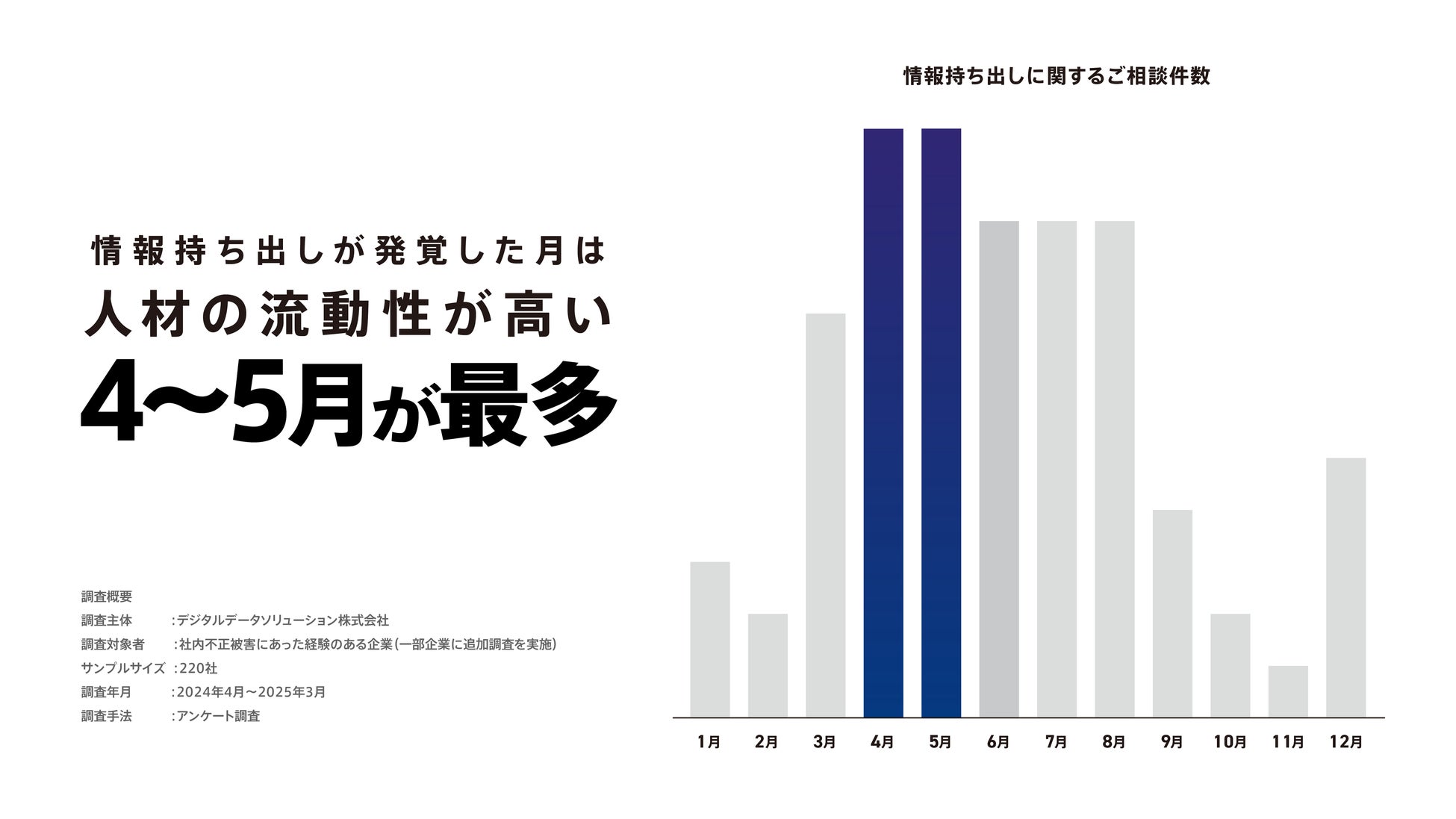 調査によると、人材の入れ替わりが活発な4~5月に情報持ち出しの発覚が多く、過去3年間も毎年4~6月に集中する傾向が見られました。