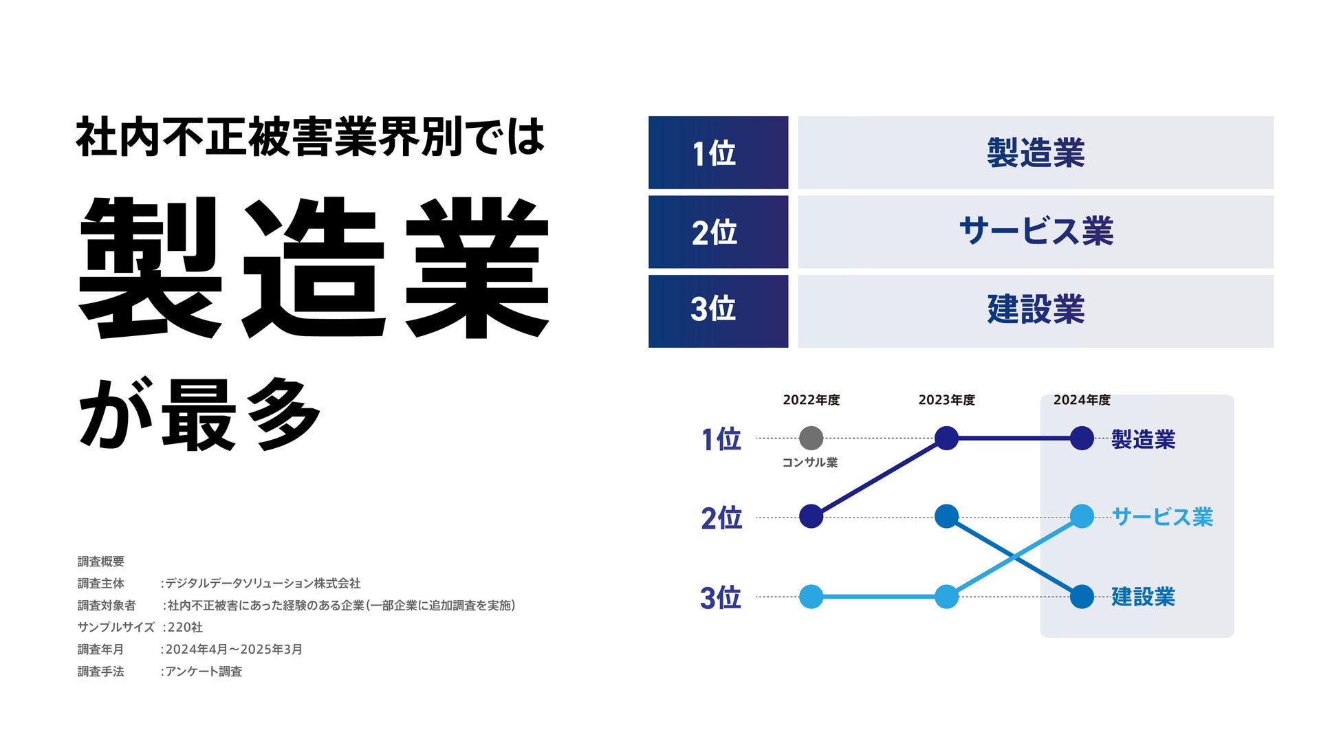 「世界中のデータトラブルを解決する」という理念のもと、フォレンジクス、データリカバリー、サイバーセキュリティ事業を展開するデータセキュリティカンパニー、デジタルデータソリューション株式会社(本社:東京都港区、代表取締役社長:熊谷 聖司、以下デジタルデータソリューション)は、社内不正被害の実態を明らかにするべく、2024年度社内不正被害にあった経験のある企業220社を対象に、実態調査を実施しました。