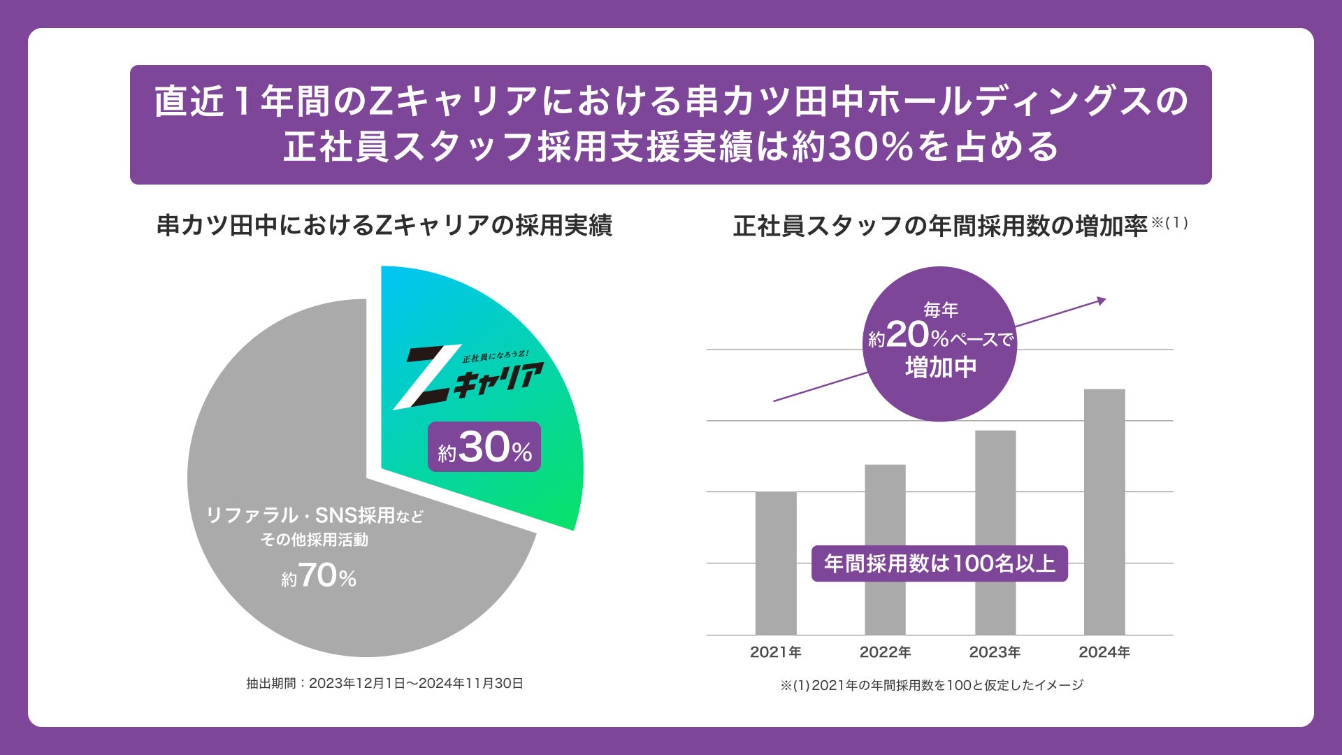 串カツ田中ホールディングスにおける店長候補などを含む正社員スタッフの年間採用は100名以上にのぼり、毎年約20%ペースで増加を続けています。直近1年間(※1)における『Zキャリア』の採用シェアは全体の約30%を占めています。
