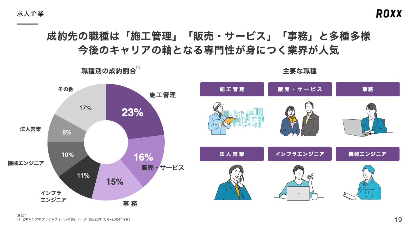 『Zキャリア』の採用シェアが大きい背景には、(1)ROXXからのみならず、『Zキャリア プラットフォーム』を利用するパートナー約400社のパートナー紹介会社からも推薦があり、母集団形成ができること、(2)求人広告や業界特化の人材紹介とは異なり、キャリアアドバイザーとのヒアリングを通して、求職者の意向や強みに基づき推薦していることから通過率が高く、ミスマッチを大きく減少させていることが要因と考えています。