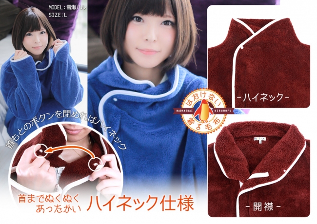 はだけない着る毛布は、お布団との相性もばつぐん。はだけないから寝返りをうっても、身体がはみ出て寒い思いをすることがありません。ハイネック仕様で、肩や首まわりも冷やさずカバー。安眠のオトモとして、パジャマと布団の間にお使いください。