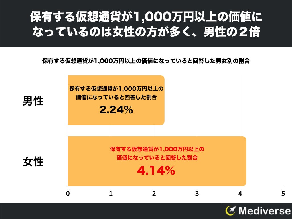 - 保有する仮想通貨が、1,000万円以上の価値になっているのは、女性の方が男性の2倍多い