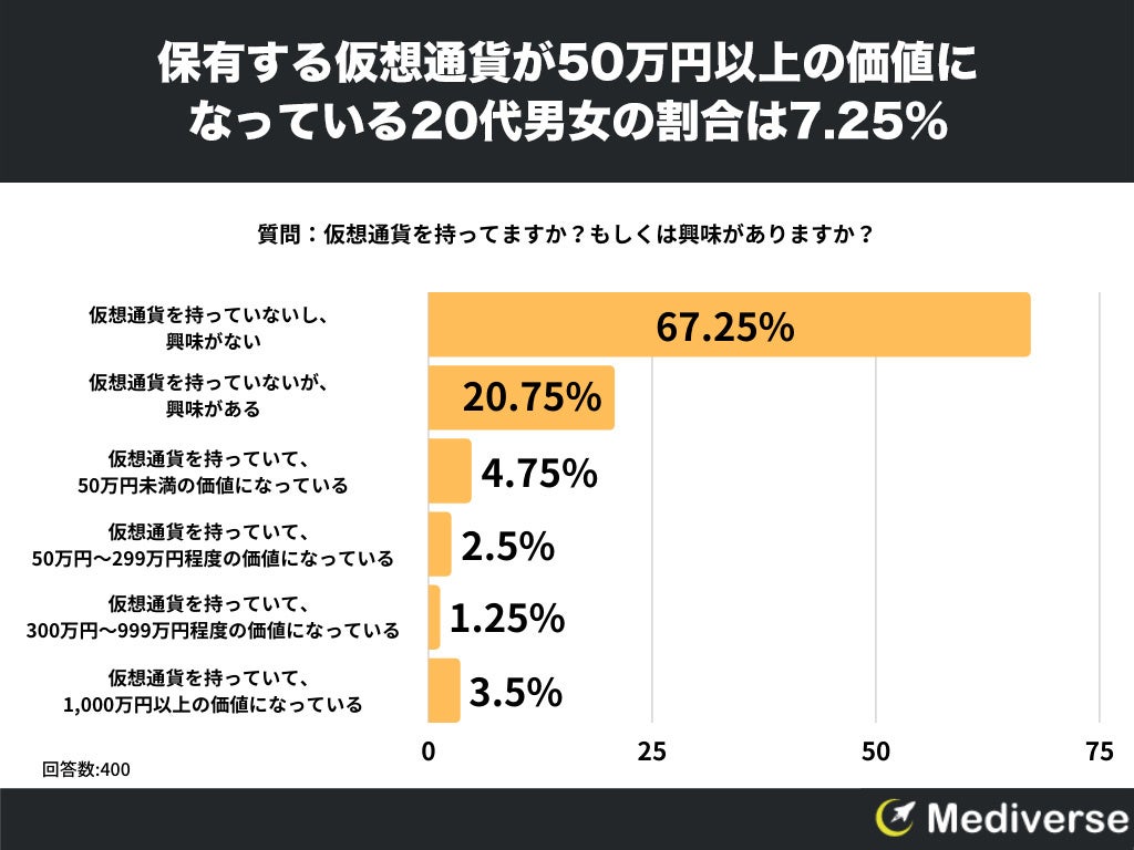 20代の男女を対象とした「仮想通貨を持ってますか?もしくは興味がありますか?」というアンケートで最も多かった回答は「仮想通貨を持っていないし、興味がない」で67.25%でした。
