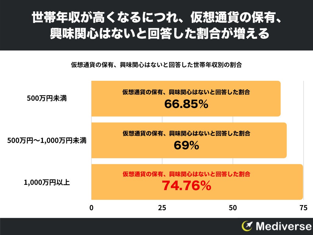 仮想通貨の保有、興味関心はないと回答した割合を世帯年収別でみてみますと、1,000万円以上が最も多く74.76%、次いで500万円~1,000万円未満が69%、500万円以下は66.85%にとどまりました。