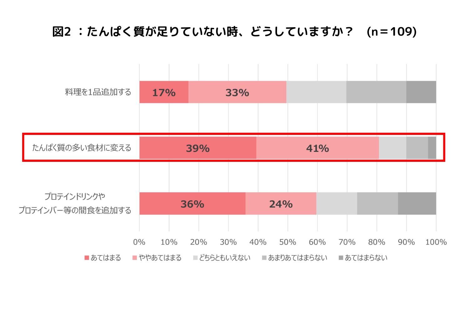 「たんぱく質が足りていないときどうするか」という問いに対しては、96%のユーザーが料理や商品を追加したり、食材を変えたりする方法を使って解決したいと回答しました(※2)。特に多かったのは「たんぱく質の多い食材に変える」と回答したユーザーで80%を超えました。(図2)
