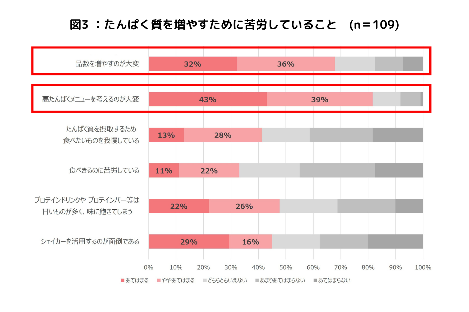 一方、「たんぱく質を増やすために苦労していることはありますか?」と聞いたところ、「品数を増やすのが大変」に対して「あてはまる」「ややあてはまる」と回答した方が約7割、「高たんぱくメニューを考えるのが大変」に対して「あてはまる」「ややあてはまる」と8割以上の方が回答しました(図3)。