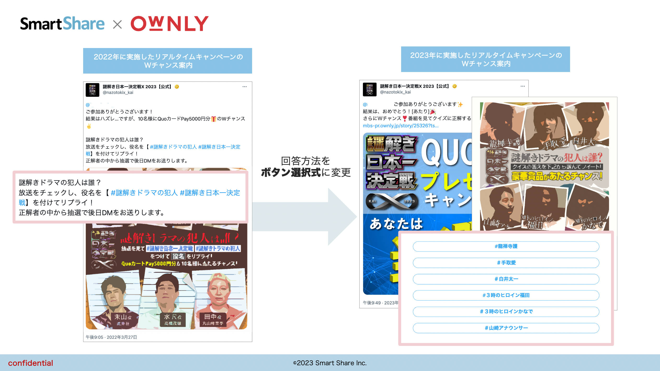「謎解き日本一決定戦X 2023」放送中にインスタントウィンキャンペーンを開催。昨年も同番組でインスタントウィンキャンペーンを実施していますが、今回は「キャンペーン参加者数を増やすこと」「リアルタイム視聴を促進すること」を意識して施策内容を改善。例えば昨年のキャンペーンでは謎解きの答えをリプライで入力し、タグ付けする建付を、今回は参加ハードルを下げて擬似カンバセーショナルボタンを用いた回答方法に変更いたしました。その結果、キャンペーン参加者の前回比は115%で、Wチャンス参加者の前回比が131%でした。