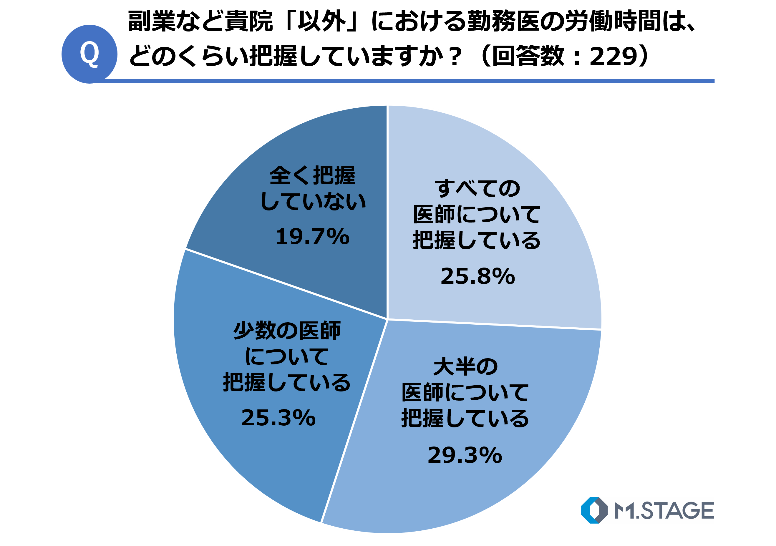 副業などの自院「以外」での「労働時間管理」について、「すべての医師について把握している」が25.8%、「大半の医師について把握している」が29.3%となり、自院の勤務時間の把握状況と比較すると、3割ほど低くなることがわかりました。