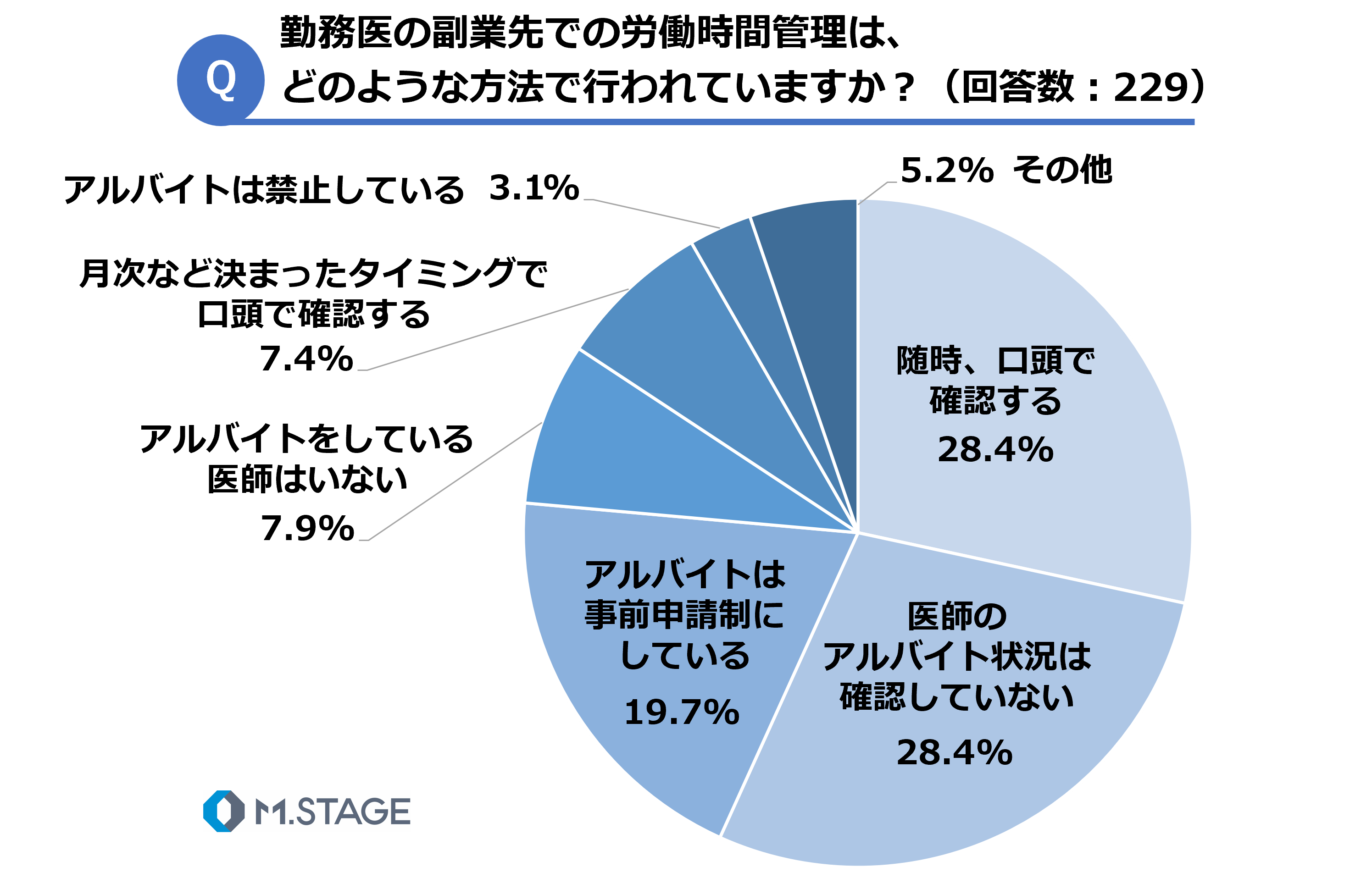 また、副業先の労働時間把握の方法としては、「随時、口頭で確認する」(28.4%)、同率で「医師のアルバイト状況は確認していない」(28.4%)となり、次いで「アルバイトは事前申請制にしている」が19.7%となりました。