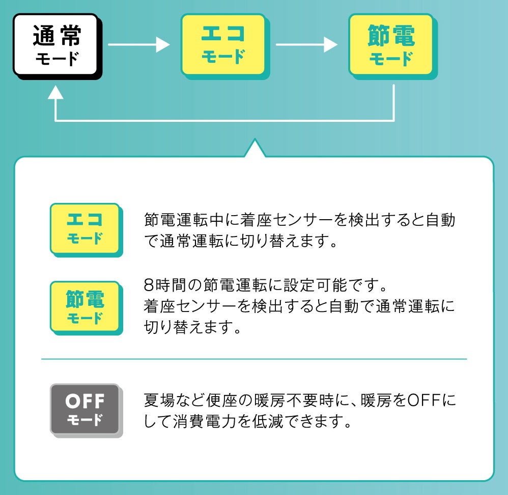 便座には断熱材を搭載した「スマート暖房便座」を採用し、着座していないときの便座温度を約28℃に下げ節電する「エコモード」、一定時間便座ヒーターへの通電を止めて電力消費を抑える「節電モード」などのモードをお選びいただけます。また便座の暖房が不要な夏場などでは、暖房をOFFにすることでより消費電力を低減できます。さらに「温水温度設定機能」を搭載し、温水の温度を6段階で切替(OFF・35~39℃)