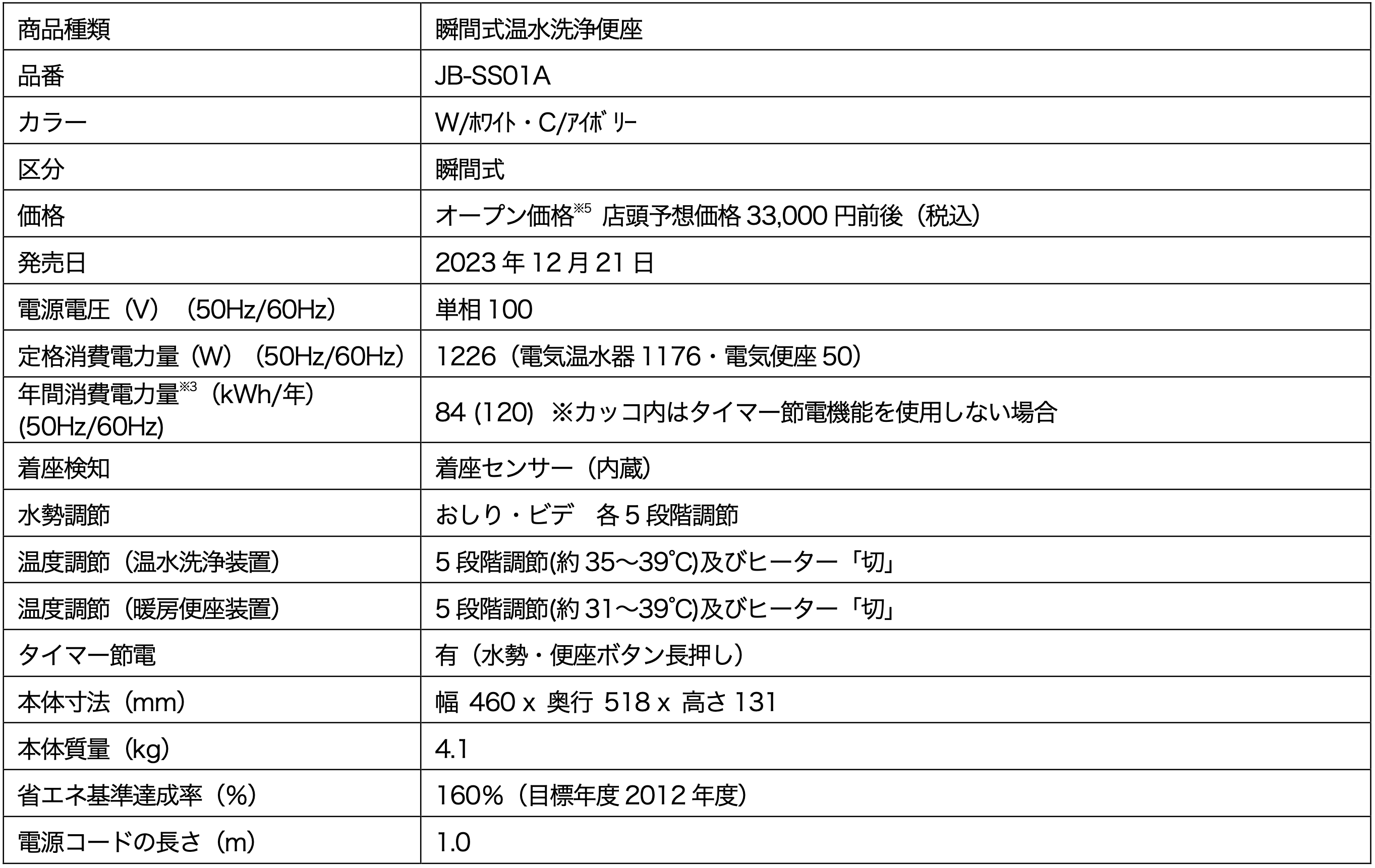 瞬間式温水洗浄便座(JB-SS01A)の概要は以下の通りです。
