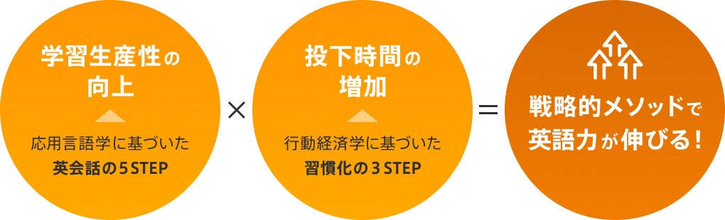 英語力の向上には、①学習生産性(質)と②学習投下時間(量)の両方を最大化することが重要です。英語コーチング「プログリット」では、応用言語学を元にした「英会話の5ステップ」というフレームワークに基づき、効果的な英語学習を提案しております。また、学習データやコンサルタントの実践を踏まえた独自のコーチング手法により、学習の習慣化を促すことで、英語力を短期間で伸ばすに必要な学習時間の確保も実現しております。