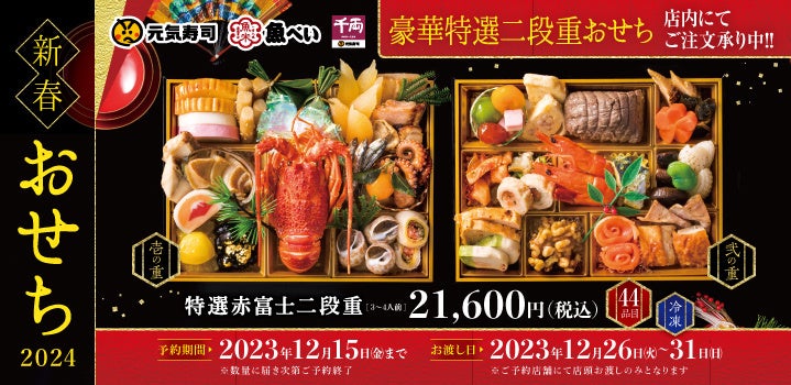 縁起の良い素材や豪華食材を盛り込んだ44品目の厳選二段重!元気寿司グループ初の新春おせち『特選赤富士二段重』ご予約受付中!