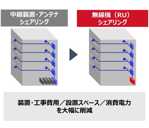 設備構成上、無線機までのシェアリングが可能となり、アンテナ/中継装置までのシェアリングと比較し、設置スペース、設備費・工事費、消費電力の削減が実現