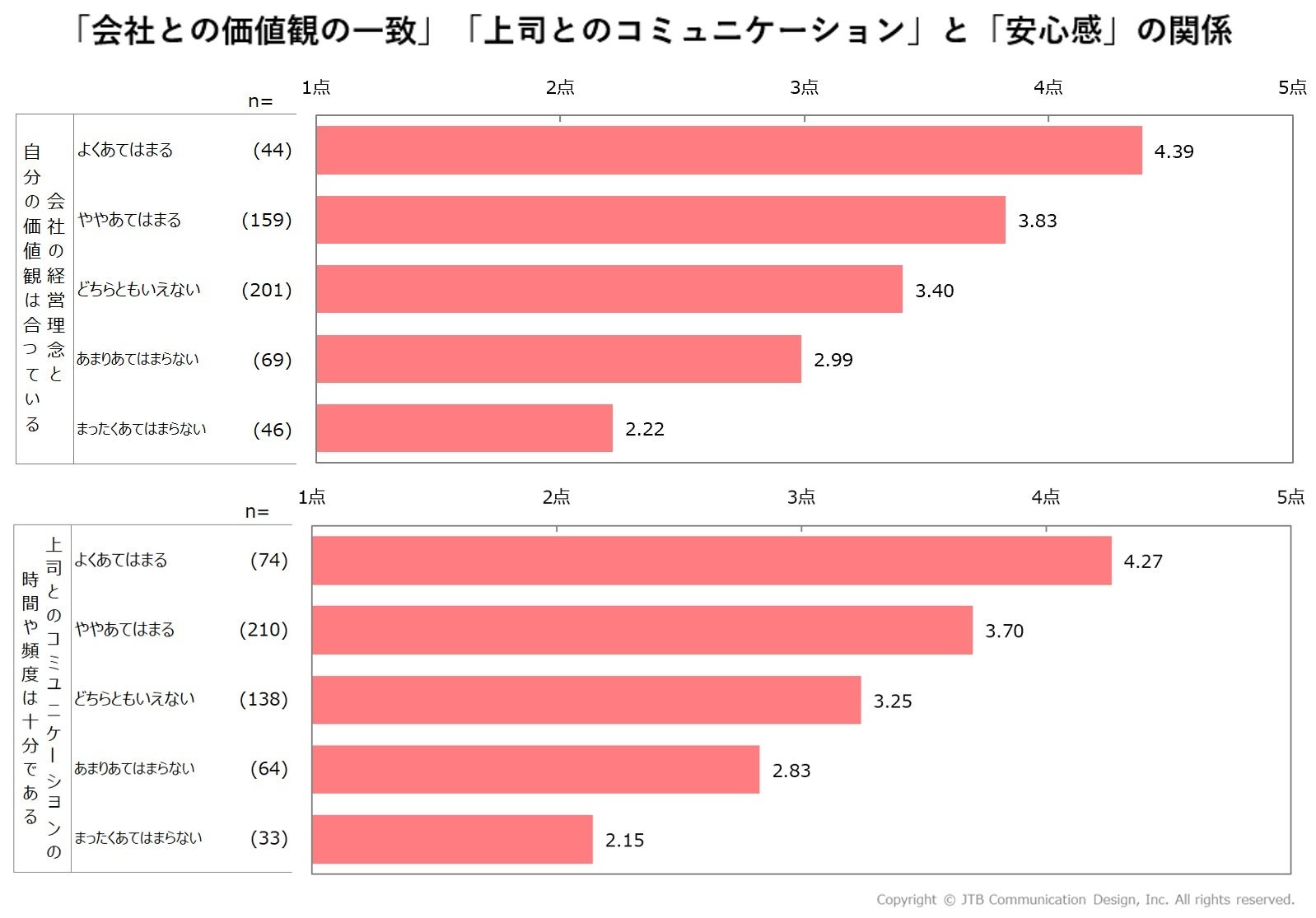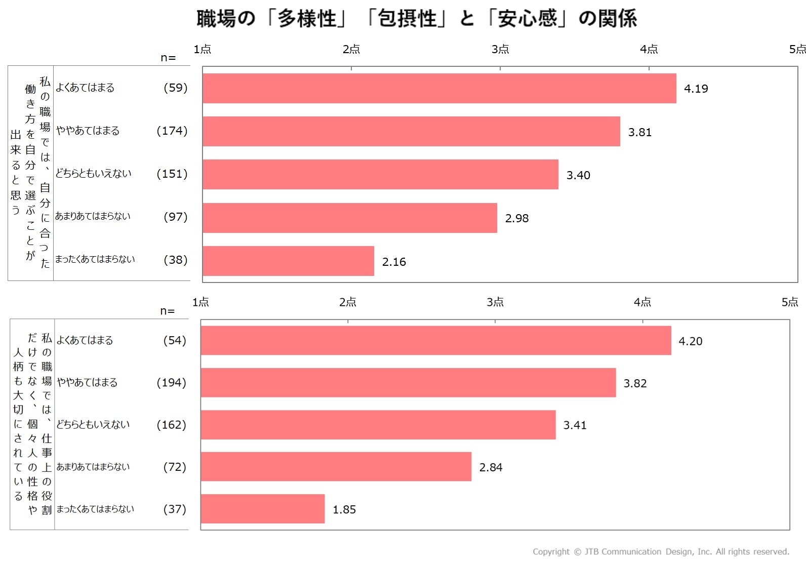 職場に多様性や包摂性が確保されることや自分の価値観と会社の価値観が一致していると感じること、また、上司と十分なコミュニケーションを取れることが、「安心感」の向上につながり、「心理的居場所感」を高める可能性が示されました。