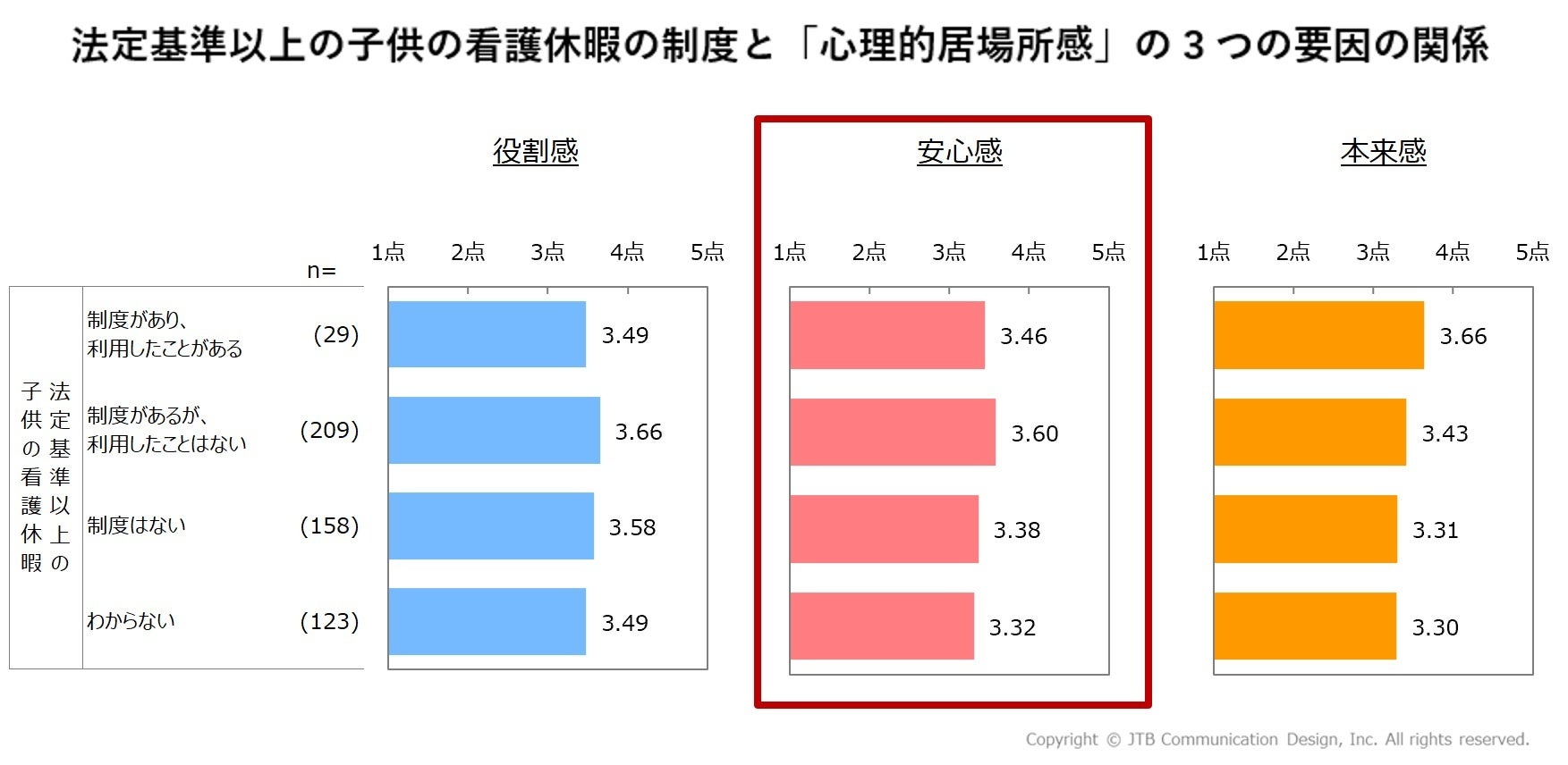 「フレックスタイム制度」について、「制度があり、利用したことがある」あるいは「制度はあるが、利用したことはない」と答えた人は、「制度はない」あるいは「わからない」と答えた人に比べて、「役割感」「安心感」「本来感」すべてが高く、特に「安心感」「本来感」については統計的にも有意な差がありました。「法定基準以上の子供の看護休暇」については「制度はあるが、利用したことはない」と答えた人は「わからない」と答えた人に比べて「安心感」が有意に高いことがわかりました。