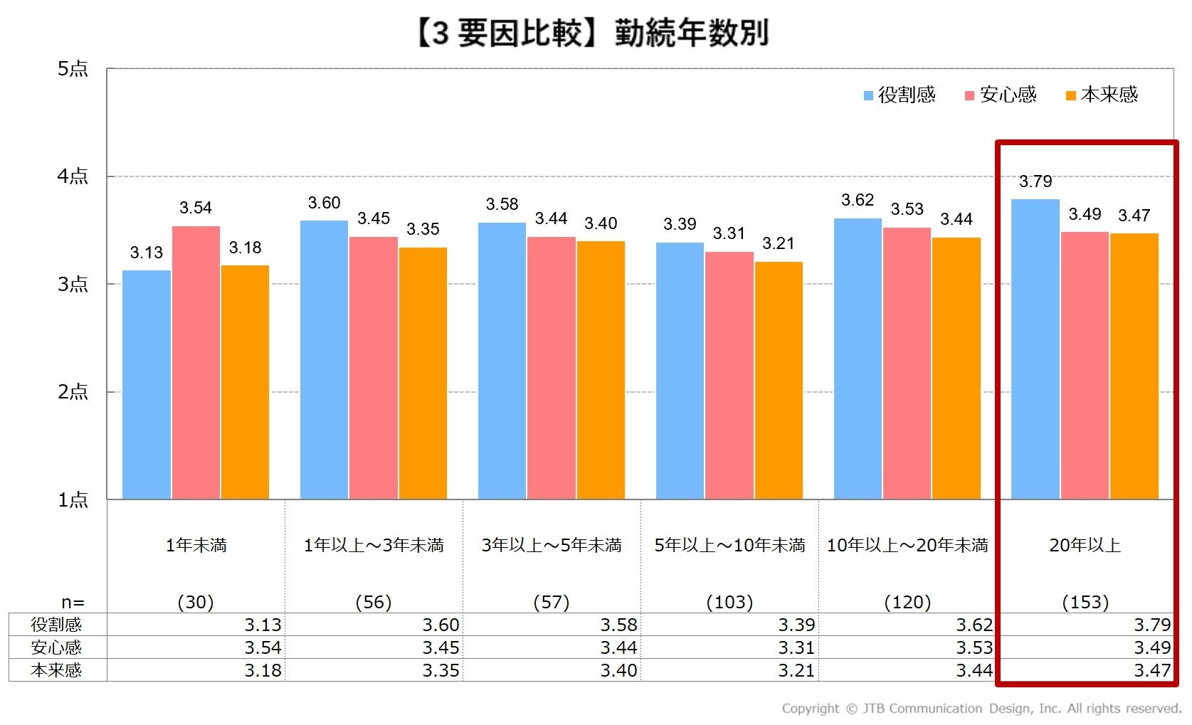 「心理的居場所感」を勤続年数別に見ると、概ね長いほど3要因とも数値が高くなり、特に20年以上では「役割感」が統計的にも有意に高いことが示されました。
