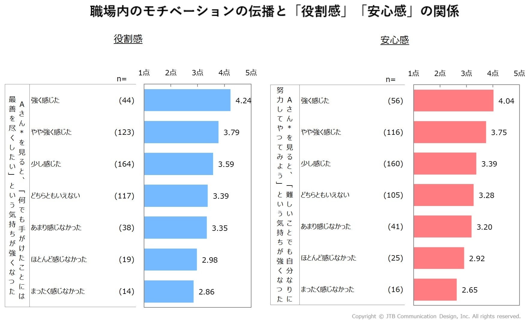 職場内で人から人にモチベーションが伝わる「モチベーション伝播」(3)という現象があります。「モチベーション伝播」と「心理的居場所感」の関連を分析した結果、<Aさん*を見ると、「何でも手がけたことには最善を尽くしたい」という気持ちが強くなる><Aさん*を見ると、「難しいことでも自分なりに努力してやってみよう」という気持ちが強くなる>というモチベーション伝播に関する項目について、より強く感じた人ほど「心理的居場所感」の3要因の数値が高く、「心理的居場所感」と職場内のモチベーションの伝播とは関連があることが示されました。