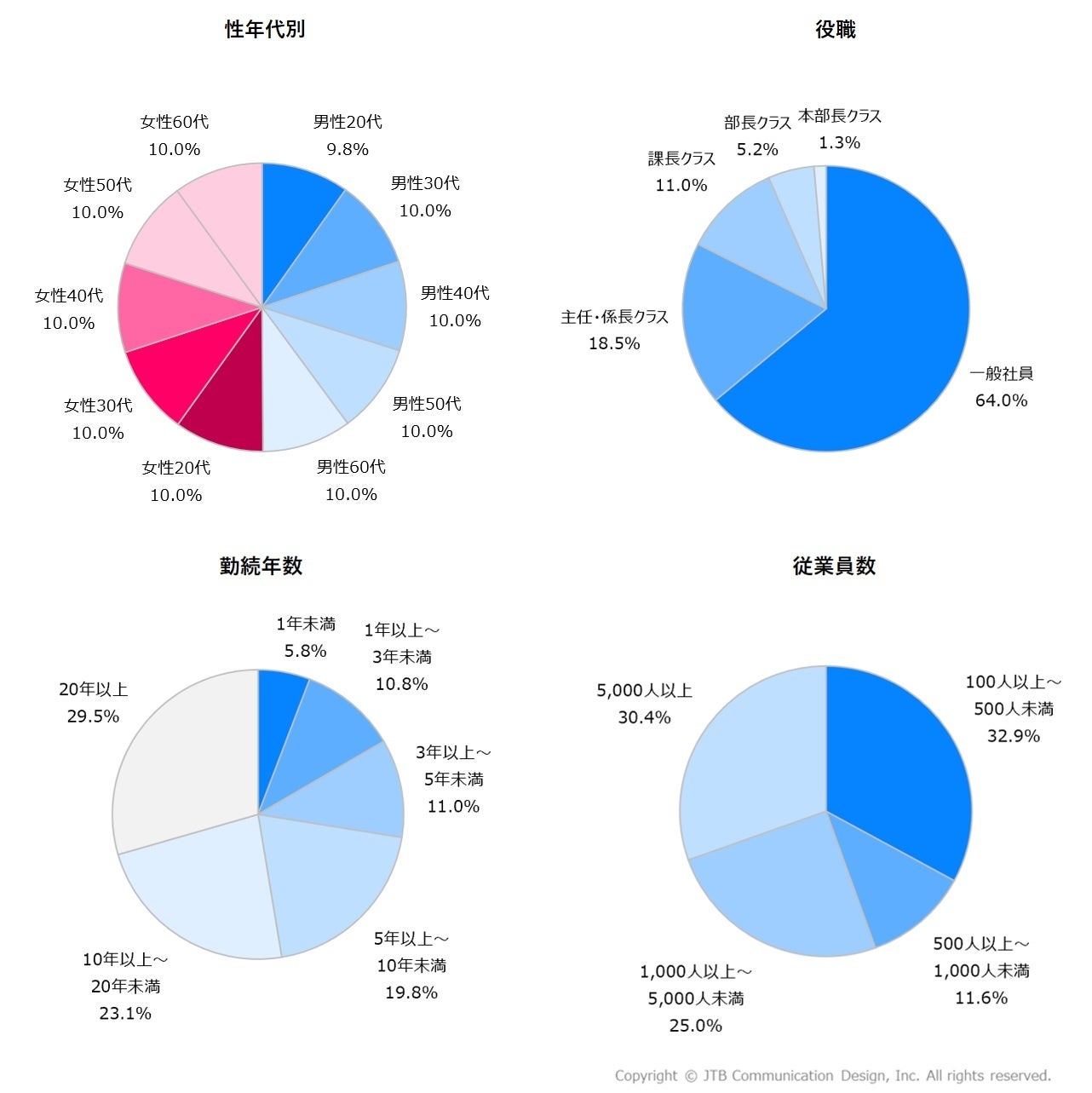 対象者を抽出するために、男女20-69歳・公務員/会社員に事前調査を実施し、従業員100人以上の会社に勤務する方を抽出しました。