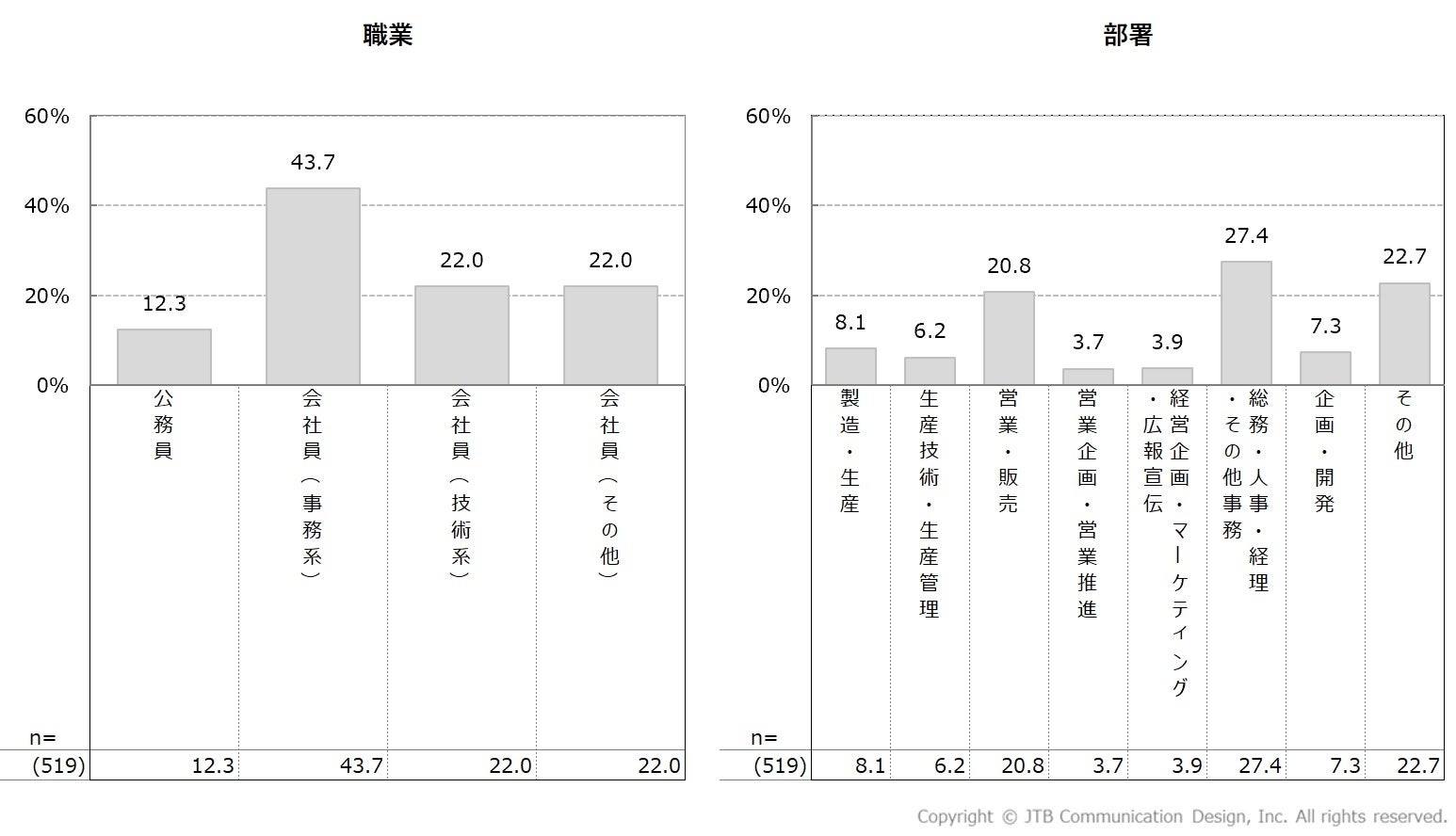 本調査での、性年代・役職・勤続年数・従業員数・職業・部署の内訳は以下の通りです。(すべてn=519)