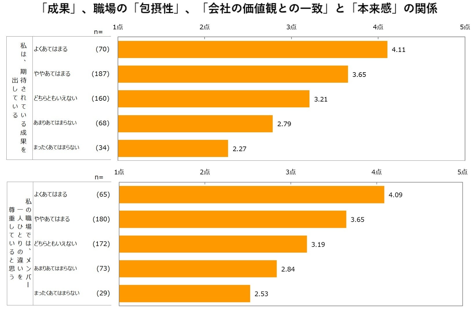 職場内で成果を出していること、職場に包摂性があること、自分の価値観と会社の価値観が一致していると感じることが、「本来感」の向上につながり、「心理的居場所感」を高める可能性が示されました。