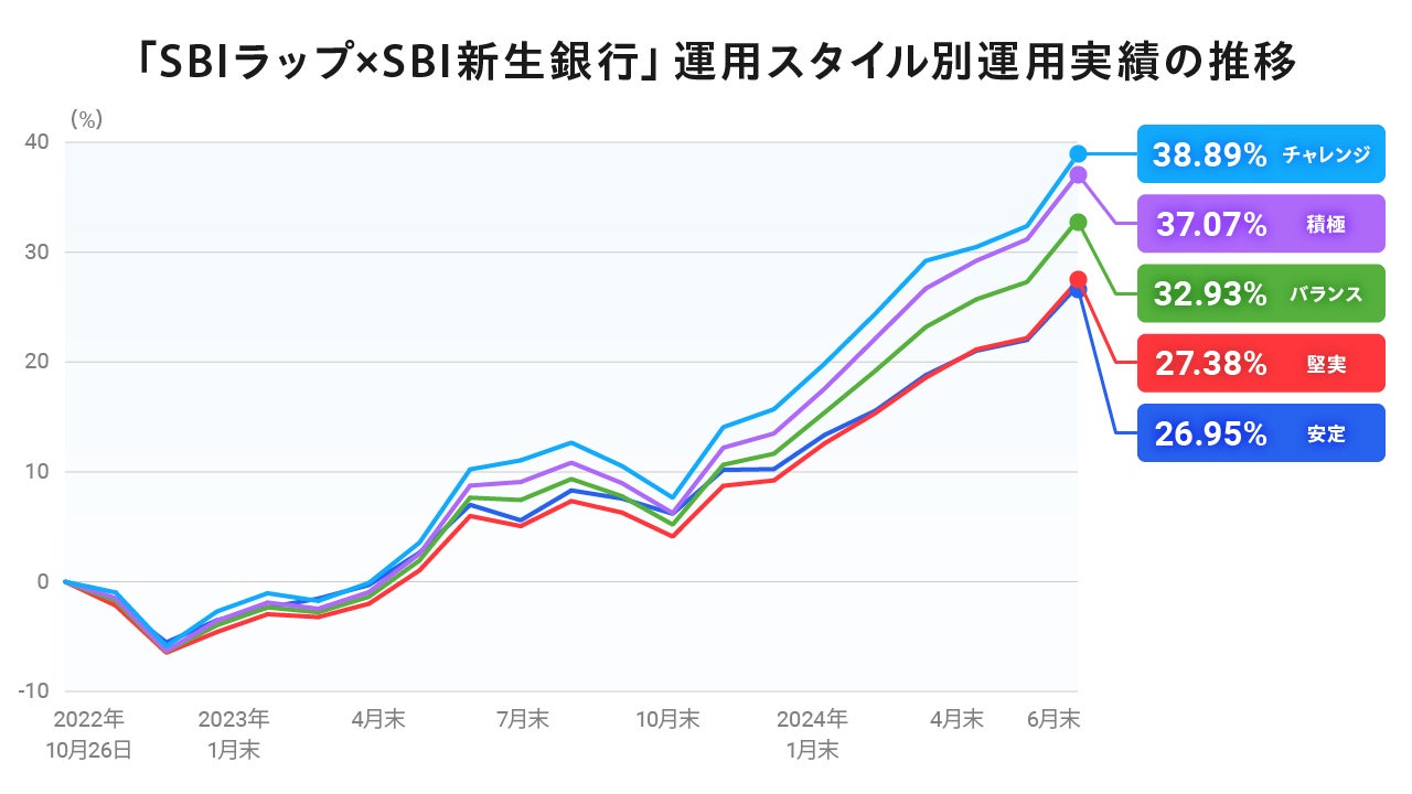 2022年10月26日(サービスリリースした2022年10月20日に申込みを行い最短で運用を開始した場合における、投資対象となる8種類の専用投資信託(以下、「投資対象ファンド」と表示)の買付約定日)から2024年6月30日まで、「SBIラップ×SBI新生銀行」に投資していた場合の運用実績です。投資対象ファンドの基準価額(信託報酬やその他の費用、投資対象ファンドを通じて保有するETFの分配金が考慮されています。)をもとに、運用手数料年率1.21%(税込)を考慮のうえ、「(計算期間終了日時価/計算期間開始日時価)-1」で計算した値を%で表示しています。リバランスは最適ポートフォリオとの乖離がないように実施したと仮定して計算しています。表示している割合は年率ではありません。計算後の数値の小数第3位以下を切り捨てて表示しています。最新の運用状況は月次レポートをご確認ください。https://www.sbishinseibank.co.jp/retail/swrap/swrap_tempo/