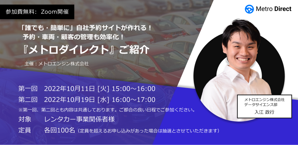 【10/11(火)・10/19(水)開催】「誰でも・簡単に」自社予約サイトが作れる!予約・車両・顧客の管理も効率化!『メトロダイレクト』ご紹介