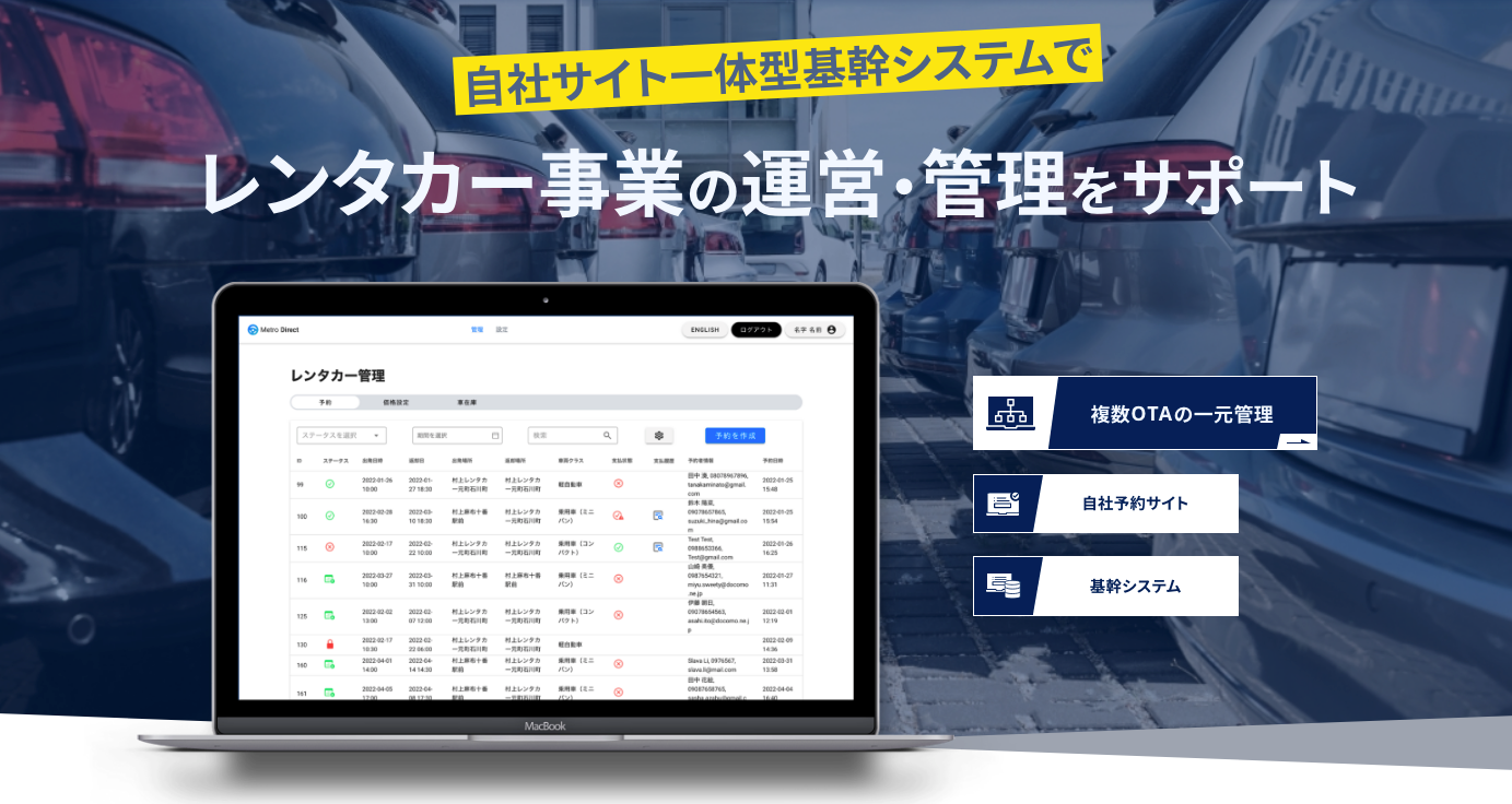 メトロエンジンは、自社予約サイトと基幹システムを兼ね備えた一体型システム『メトロダイレクト』、複数OTA一括管理システム『メトロコンダクター』を提供し、レンタカー業界のDXを推進しております。