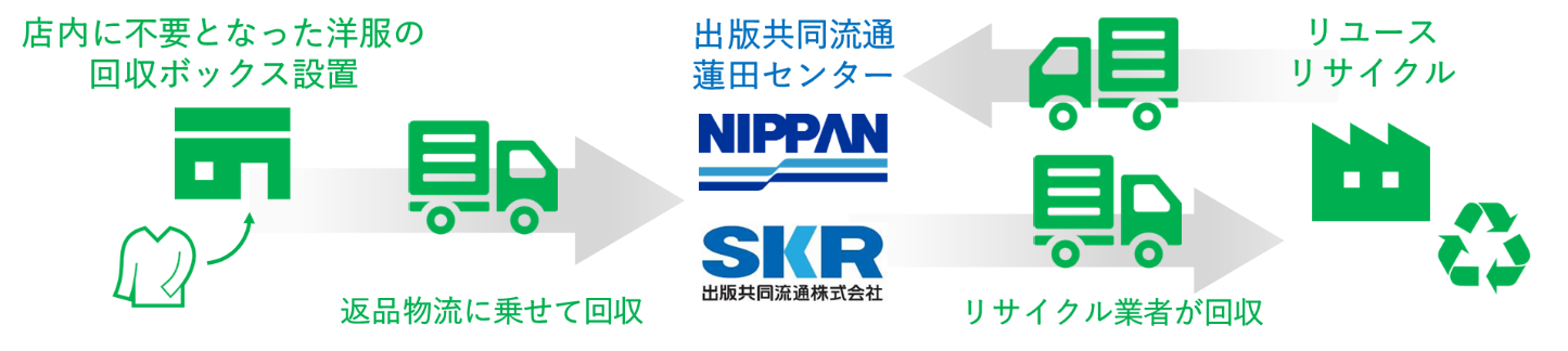 | 回収方法 | 店内にリサイクルウェア専用の回収BOXを設置し、 定期的に、出版物流の集荷担当ドライバーが回収 |