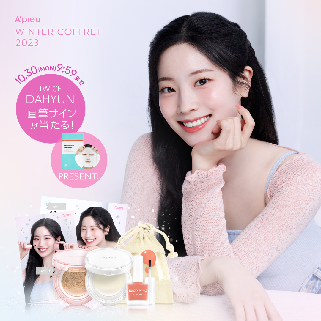 ノベルティは本コフレ限定のTWICE DAHYUNメッセージ&サイン印刷入りポストカードと、中身が見えて便利な窓付クリア巾着。さらにご予約の方限定、「アピュー マデカソ CICAシートマスク(1枚)」をプレゼントします。