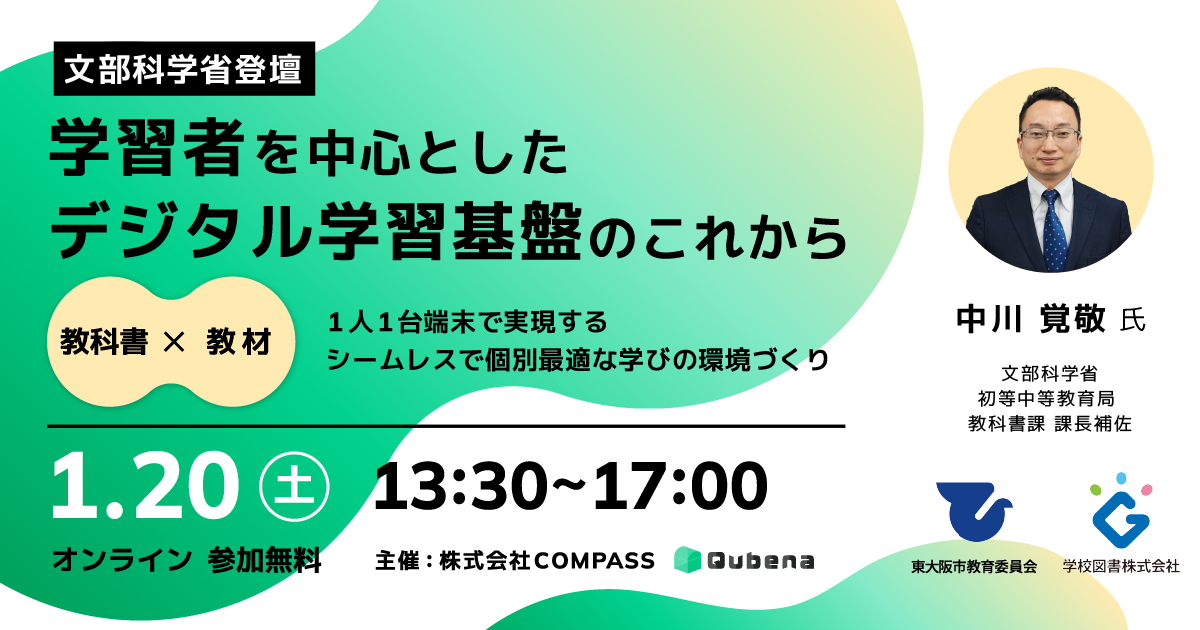 本イベントでは、基調講演に文部科学省 初等中等教育局教科書課より課長補佐の中川覚敬氏をお迎えするほか、デジタル学習基盤の整備を担う事業者の立場として、COMPASSからは教科書・教材間のシームレスな連携を進めるQubenaの最新の取り組みをご紹介。さらにパネルディスカッションでは、デジタル教科書を展開する教科書会社にも登壇いただき、デジタル学習基盤のこれからについて意見を交わしてまいります。