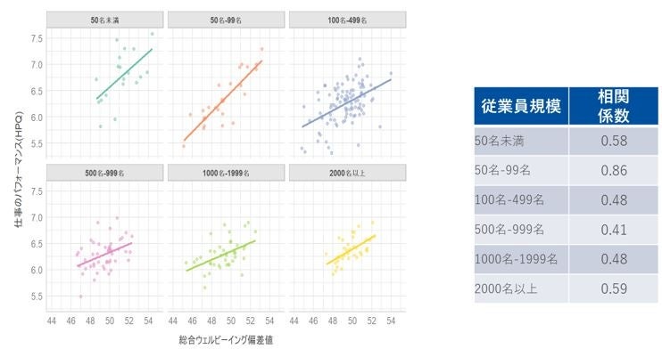結果②企業規模別:ウェルビーイング偏差値と仕事のパフォーマンスの関係を示した散布図