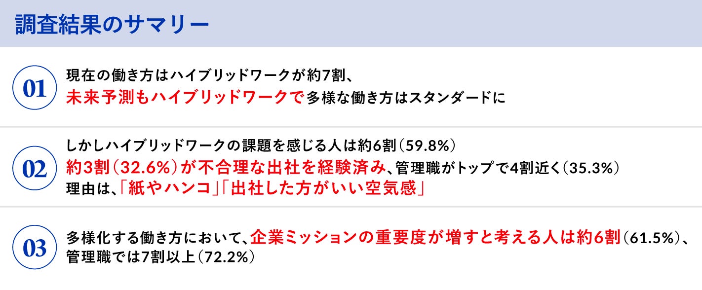 【大企業の従業員1,000名に聞いた「働き方」に関する調査】 働き方の未来予想はハイブリッド約7割も、約6割が課題認識 管理職の7割以上が企業ミッションを重要視、多様な働き方の拠り所に
