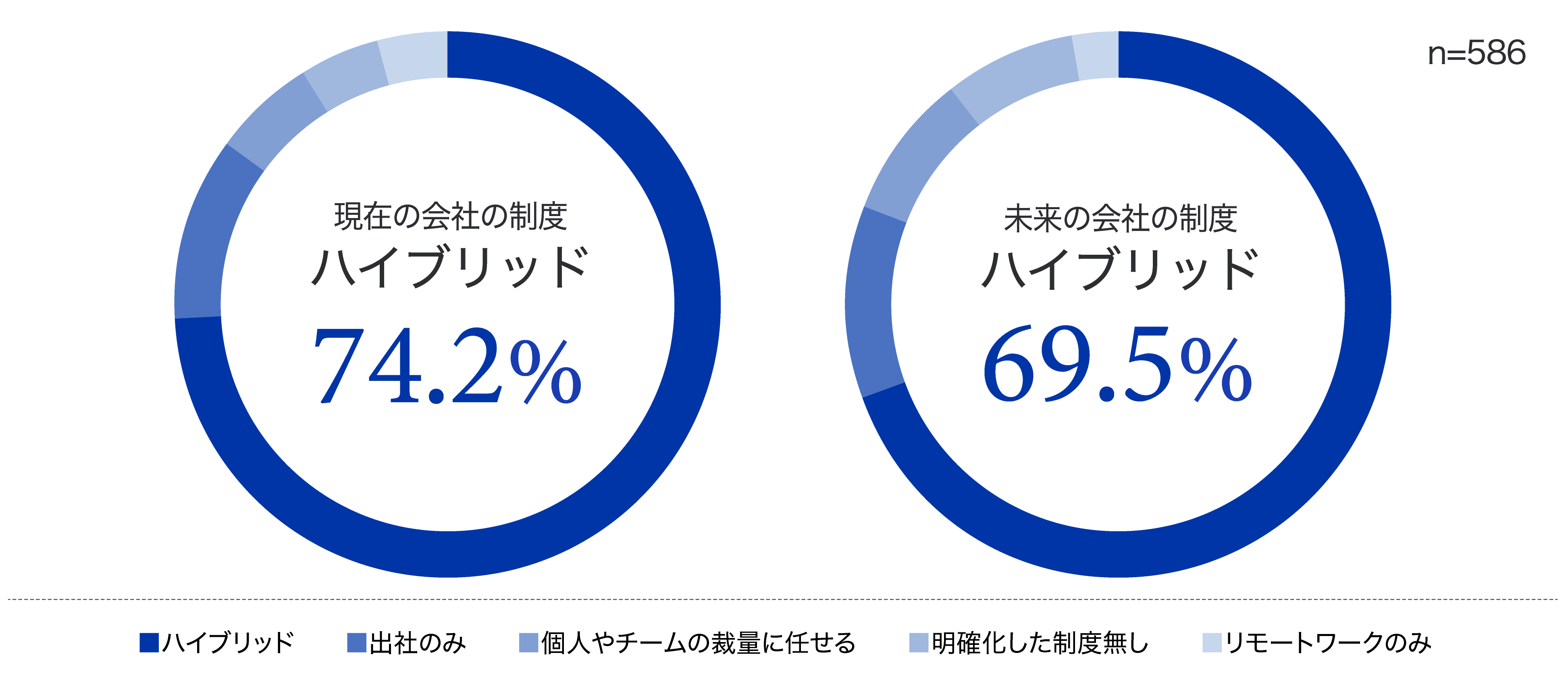 現在の働き方について聞いたところ、ハイブリッドワークが7割以上(74.2%)を占め、将来も会社の制度としてハイブリッドワークが継続される予定の人は約7割(69.5%)にのぼりました(グラフ1)。 コロナ禍において、大企業の働き方としてハイブリッドワークが主流であることが明らかになっています。