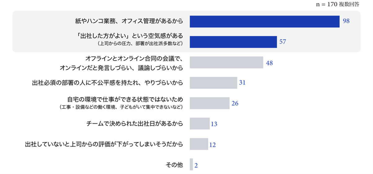 約3割(32.6%)が不合理な出社を経験済み、管理職がトップで4割近く(35.3%)理由のトップは「紙やハンコ」、2位は「空気感」