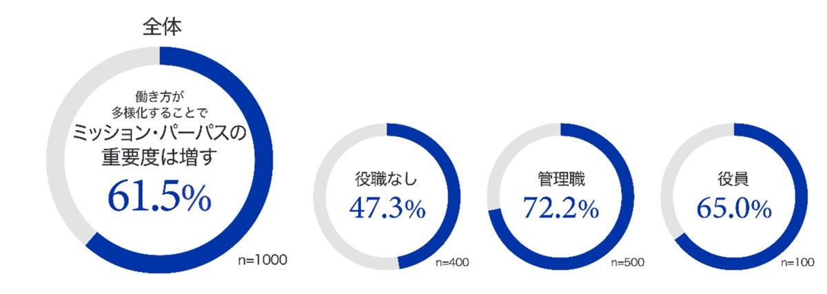 ■多様化する働き方において、企業ミッションの重要度が増すと考える人は約6割(61.5%)、管理職では7割以上(72.2%)