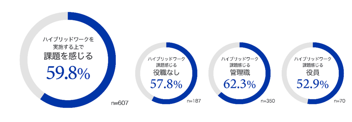 企業にハイブリッドワークが浸透している一方、ハイブリッドワークの課題を感じている人は約6割(59.8%)にのぼり、役職別では管理職が最も多く6割以上(62.3%)が課題を感じていることが明らかになりました(グラフ2)。