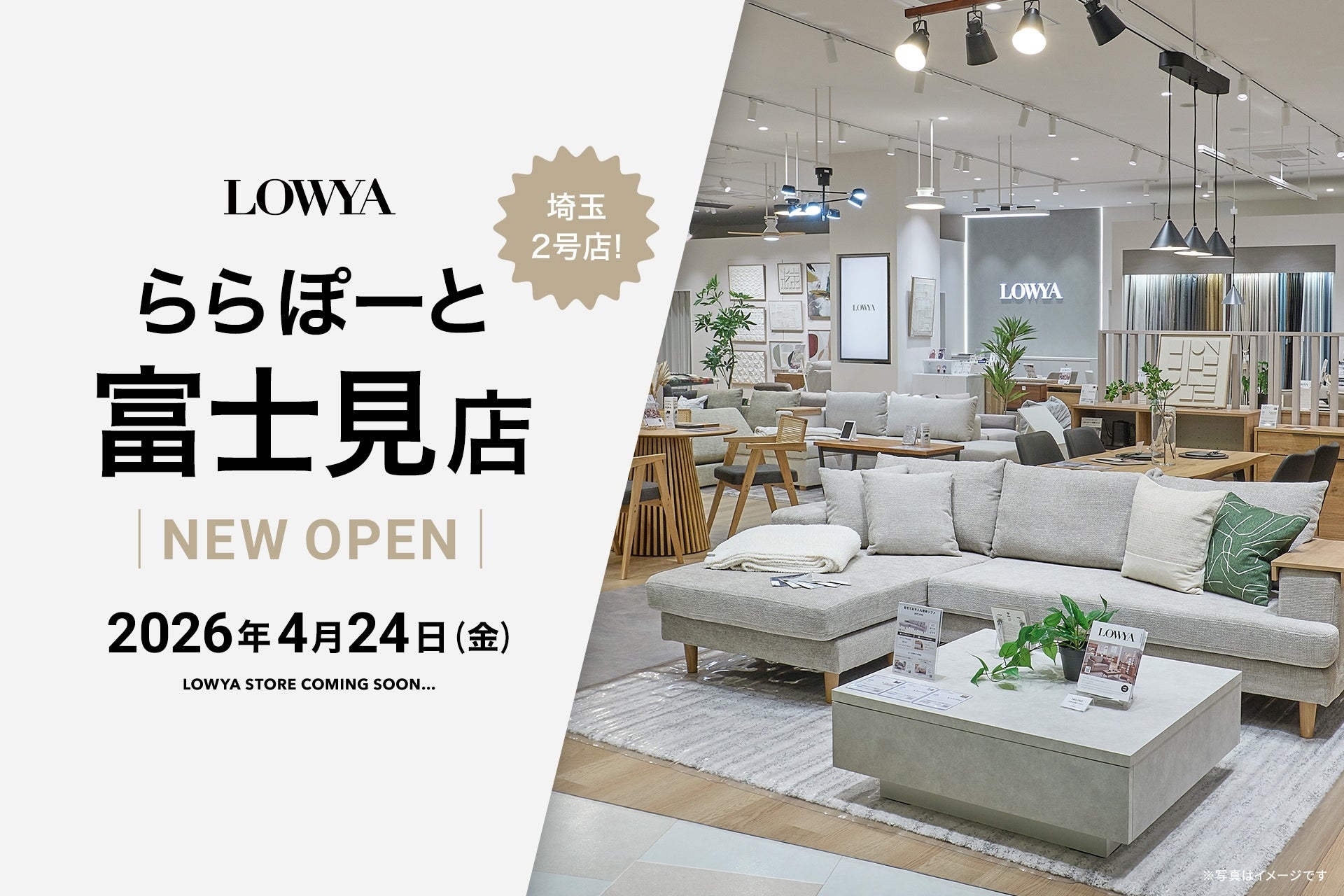 株式会社ベガコーポレーション(本社:福岡県福岡市博多区、代表取締役社長:浮城 智和、証券コード:3542、URL:https://www.vega-c.com 以下:ベガコーポレーション)が運営する、家具・インテリアブランド「LOWYA」(呼称:ロウヤ、URL:https://www.low-ya.com/)は、2026年4月24日(金)に「LOWYAららぽーと富士見店」をオープンいたします。2025年11月に開業したららぽーと新三郷店に続き、埼玉県では2店舗目、LOWYAの実店舗としては通算15店舗目の開業となります。