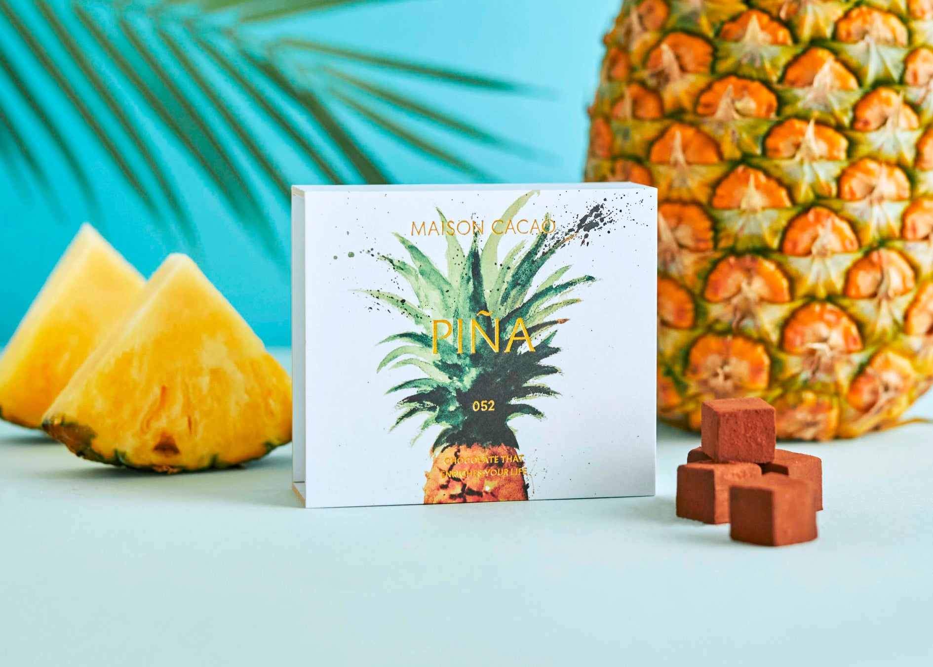 国内生産量が1%以下の、沖縄県名護市で栽培される希少な品種のパイナップル、ゴールドバレルを使用した生チョコレートです。糖度が高く、芯まで食べられるほど柔らかい果肉で、パイナップル特有のえぐみや酸味が少ない、爽やかな甘みが特徴です。ゴールドバレルの爽やかな甘みと瑞々しさを引き立てる、コロンビア産の柔らかなカカオテイストを持つミルクチョコレートと合わせました。