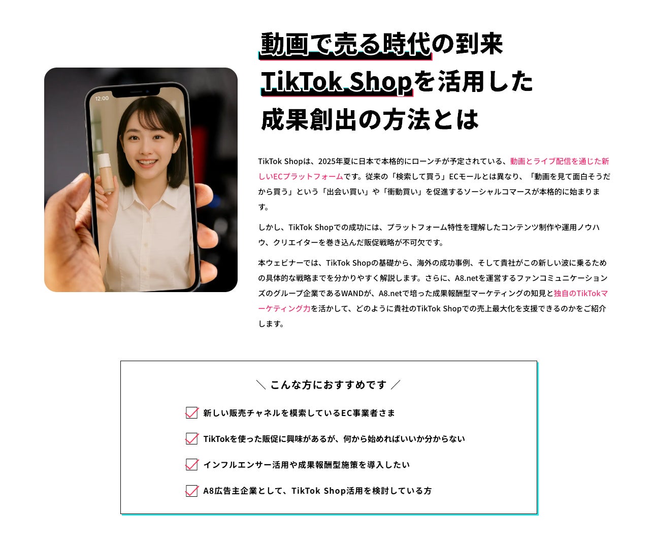 国内最大級ASP「A8.net」運営グループの運用知見とTikTokマーケティング支援のWANDのノウハウに基づき、ブランドのTikTok Shopでの攻略方法を解説!