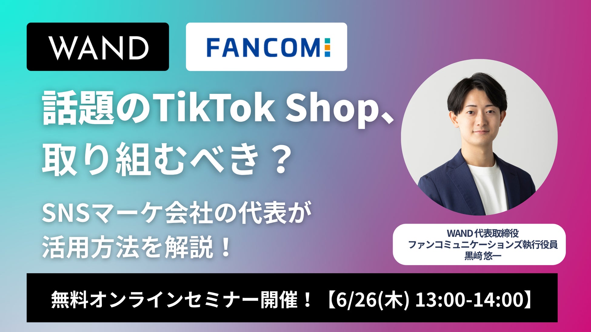 プロシューマー支援事業を展開する株式会社ファンコミュニケーションズ(本社:東京都渋谷区、代表取締役社長:二宮幸司 東京証券取引所プライム市場:2461)の連結子会社で、成果報酬型インフルエンサーマーケティングサービス「NOX」を始めとするフルファネル型ソーシャルメディアマーケティング支援を提供する株式会社WAND(本社:東京都渋谷区、代表取締役社長:黒﨑悠一、以下「WAND」、会社HP:https://thewand.jp/)は、国内でのTikTok Shop本格展開に先駆けて、2025年6月26日(木)13時〜14時にTikTok Shopを活用した売上拡大戦略を解説する無料オンラインセミナーを開催することをお知らせいたします。