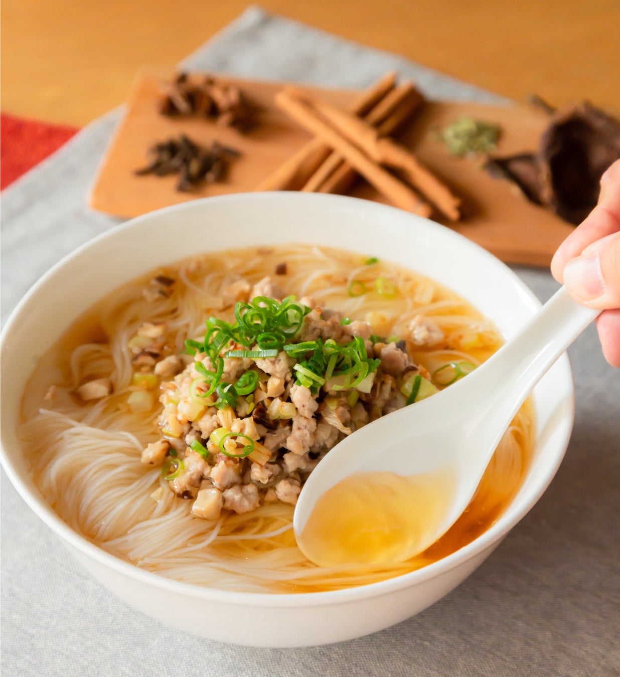 旨味のつまったあっさりしたスープとの一体感が味わえる「しなやかさ」と、お米のめん特有の「もっちりさ」を合わせ持った汁専用のビーフンを使用しています。