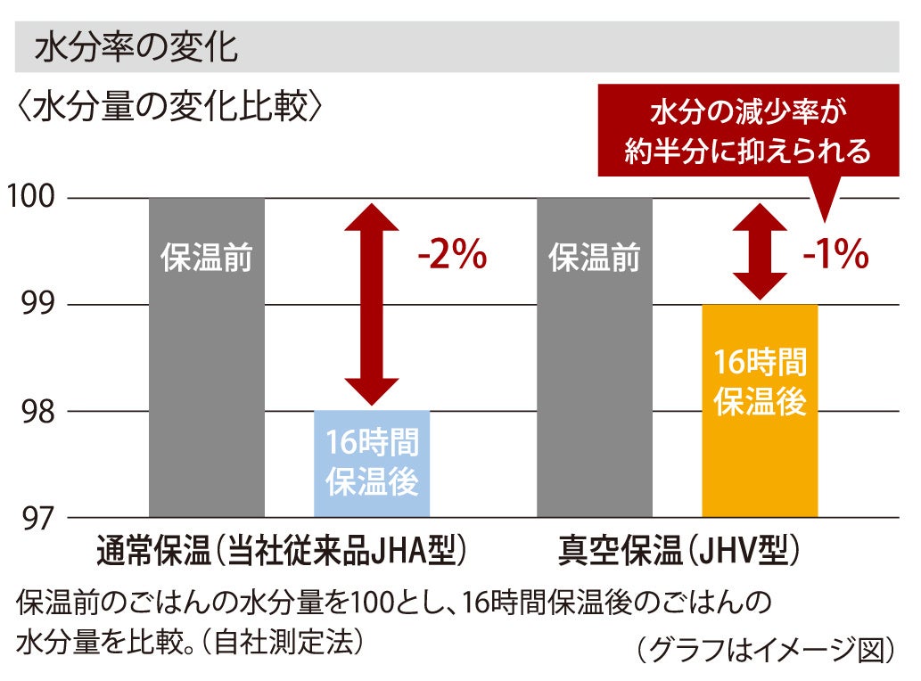 真空保温は通常保温に比べ、水分の減少率を約半分に抑え、黄ばみも抑えることができます。また、長時間保温によって生じるごはんの固さやべたつきも通常保温に比べ抑えられることで、お客様に16時間真空保温後のごはんを安心してご提供していただけます。
