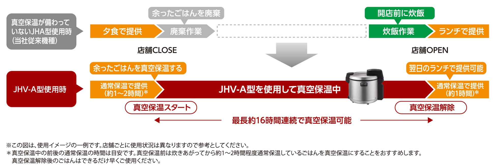 真空保温が備わっていない当社従来機種(JHA型)では保温時間は12時間以内とするよう推奨しておりましたが、本商品は乾燥や黄ばみを抑えて連続約16時間まで真空状態で保温が可能なため、従来なら廃棄するタイミングであったごはんを提供していただけます。