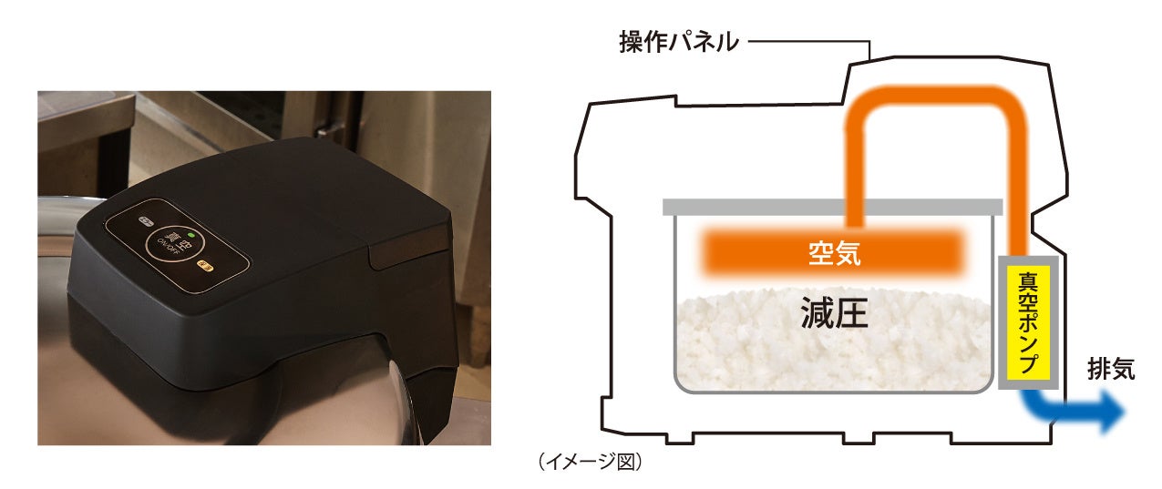 例えば、閉店後に余ったごはんは廃棄するのではなく、本商品を使用して最長約16時間真空状態で保温することで、翌日開店後のランチ時間帯に提供していただけます。ごはんの廃棄量を削減するだけでなく、閉店後の廃棄作業、開店前の炊飯作業の手間も減らすこともできるため、オペレーション改善にも貢献いたします。