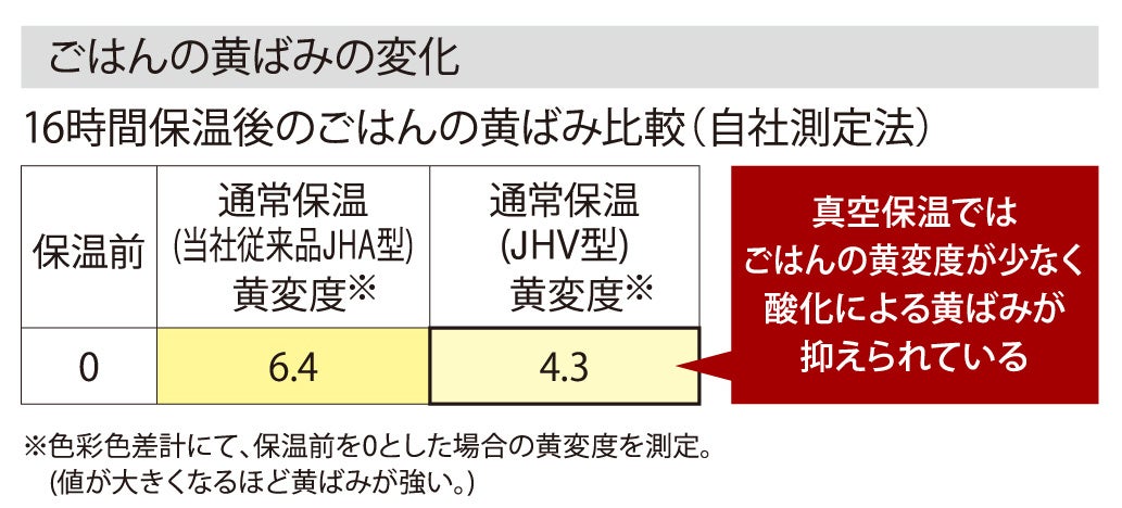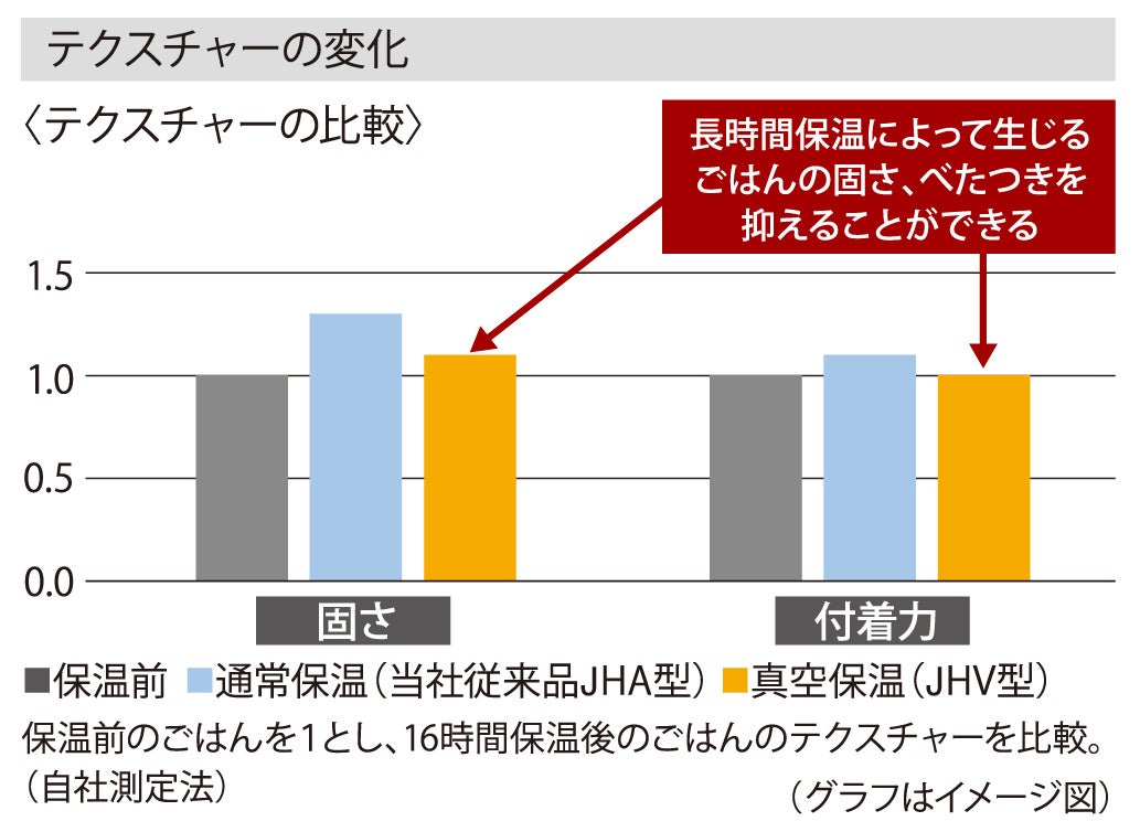 ※各データの測定はジャー炊飯器で炊飯したごはん5合をJHA型(当社従来品)およびJHV型に移し、それぞれ16時間保温し測定。