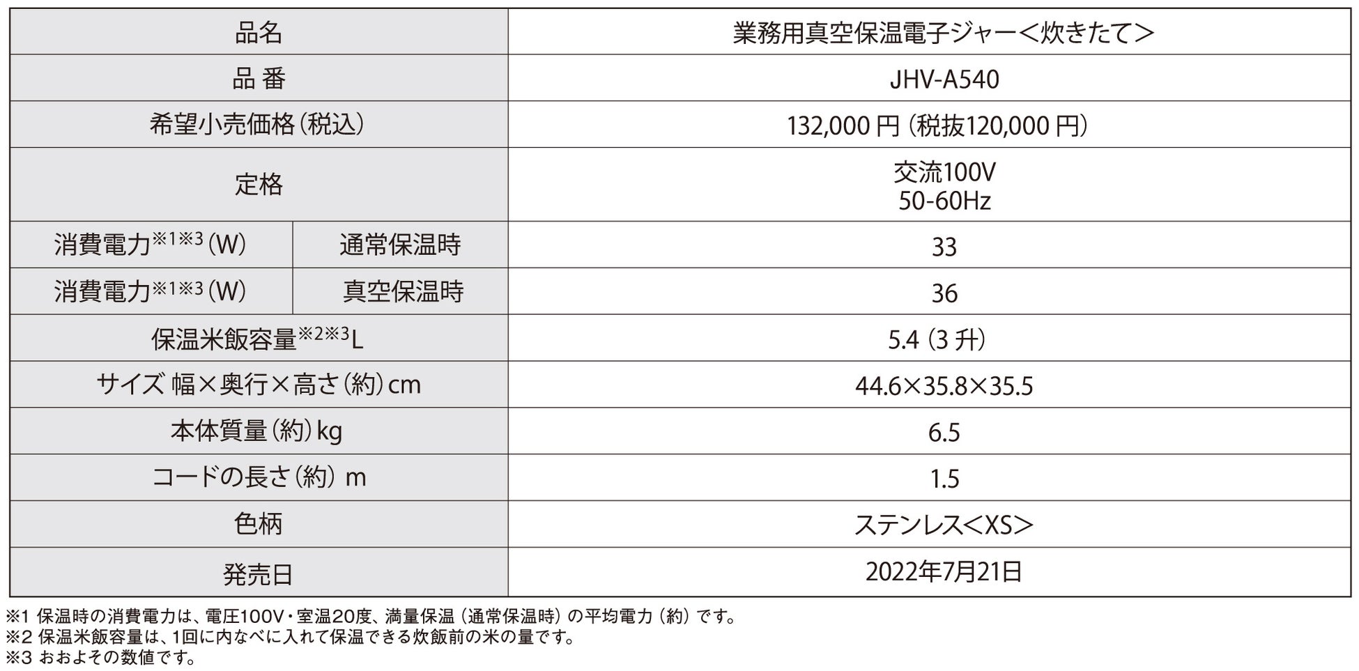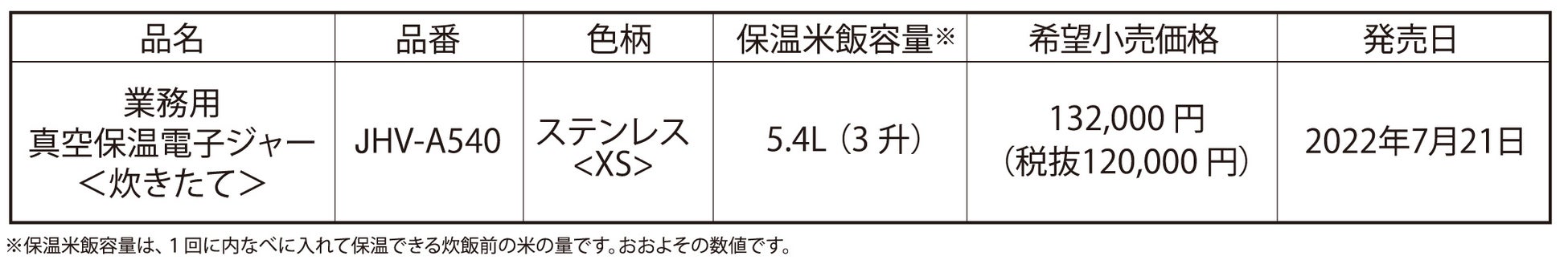 ごはんの廃棄を防ぎ、外食産業のフードロス問題の解決に貢献!真空保温で酸化を抑え、最長約16時間連続での真空保温が可能に!業務用真空保温電子ジャー<炊きたて> JHV-A540 2022年7月21日発売